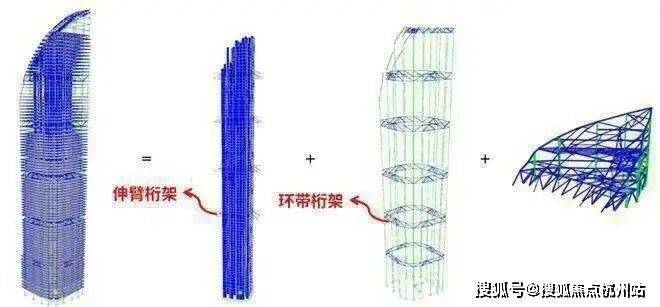 项目主体结构采用“巨型框架+核心筒+伸臂桁架+环带桁架”的结构体系。混凝土核芯筒平面基本呈六边形,由下至上合理收分。采用四道伸臂桁架,每道桁架高度约2m,沿塔楼高度结合避难层均匀分布,并在核芯筒的墙体内贯通设置钢框架,形成整体传力体系,优化结构效能。
