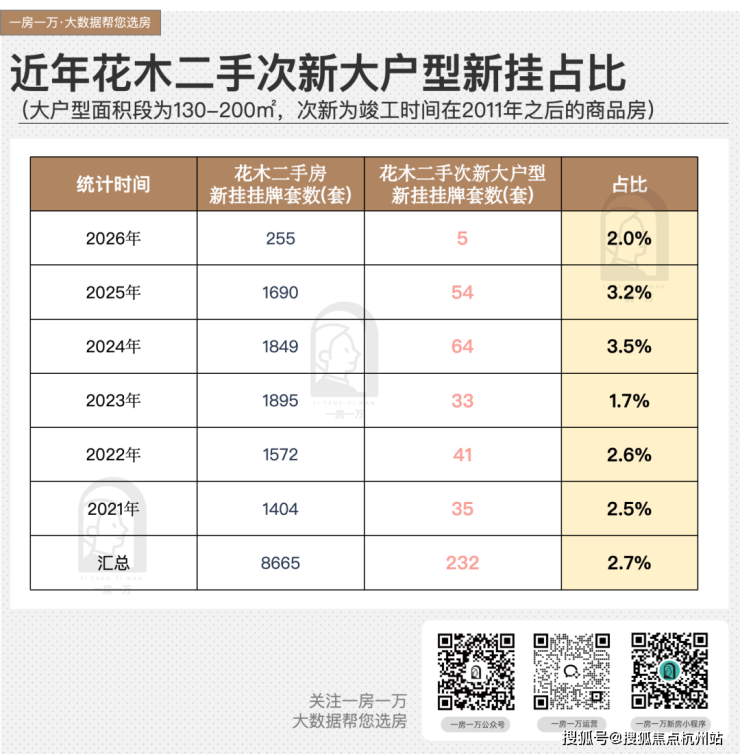 花木二手次新大户型(130-200㎡)的挂牌量,六年累计只有232套,占同期总挂牌量的2.7%。