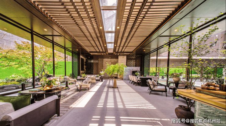 值得一提的是,会客厅做成了“无界屏”玻璃厅,巨幕玻璃可以推拉,自由采光,风也能吹入堂,空间场景可以瞬时转换。