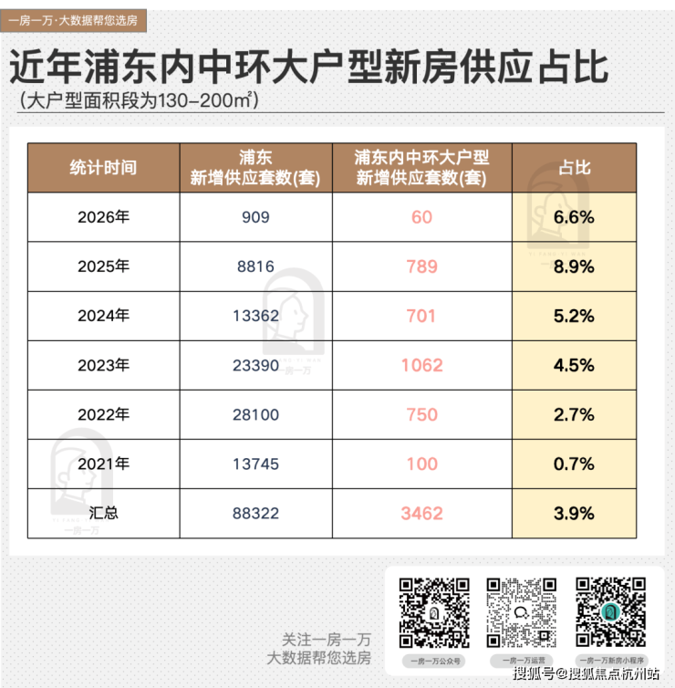 2021年至今,浦东累计供应新房约88322套。其中,内中环130-200㎡的改善大户型,只有约3462套,全区占比约3.9%。