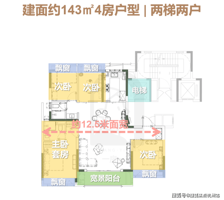 建面约143㎡户型是为一步到位准备的。 类一梯一户设计,电梯厅空间可以独立使用,鞋柜、雨伞、快递都能放在外面,室内空间更干净。
