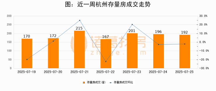 从存量房来看,2025年07月25日杭州存量房单日成交192套,比昨日减少4套,环比下降2%。从近一周存量房成交来看,杭州存量房日均成交套数为187套,07月25日单日成交192套,高于近一周平均水平2.7%。