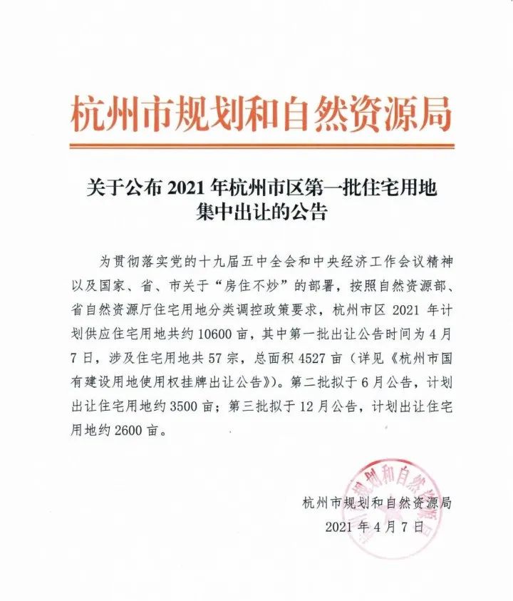 今天(4月7日)0点刚过,杭州市规划和自然资源局发布消息,为贯彻落实党的十九届五中全会和中央经济工作会议精神以及国家、省、市关于“房住不炒”的部署,按照自然资源部、省自然资源厅住宅用地分类调控政策要求,杭州市区2021年共计划供应住宅用地共约10600亩,其中排名前列批出让公告时间为4月7日,涉及住宅用地共57宗,总面积4527亩。