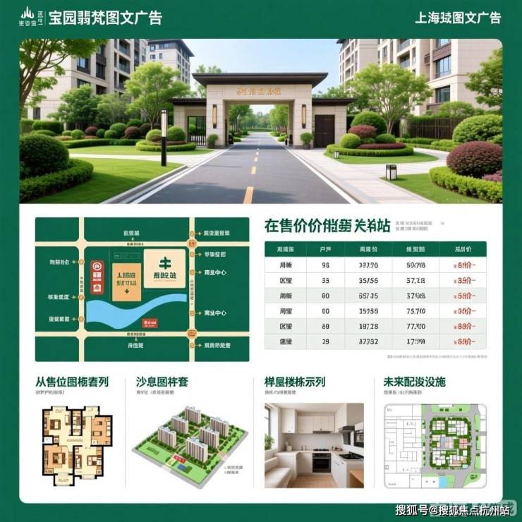 上海绿宝园翡梵楼盘,包含多种关键元素,风格偏向专业、清晰的房产展示,以突出楼盘信息和视觉呈现。
