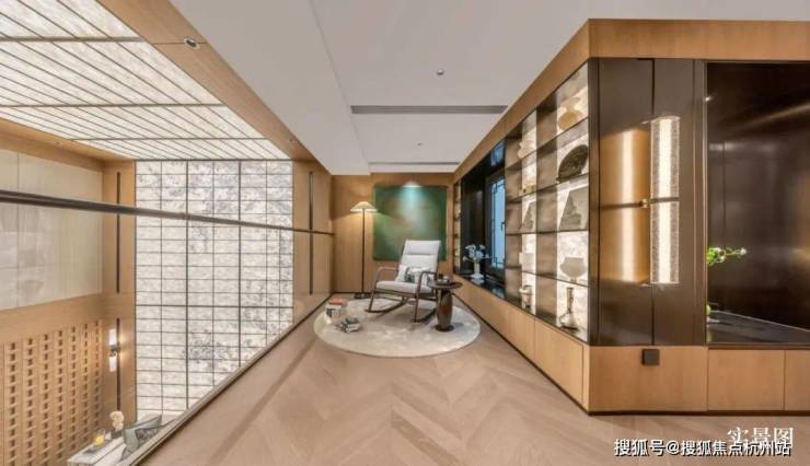 一层主要作为会客功能。样板间将一楼书房空间打开,与餐厨空间相连,更显空间感,推门就可独赏自家院中美景。 还贴心设计了一个父母房,方便老人起居。