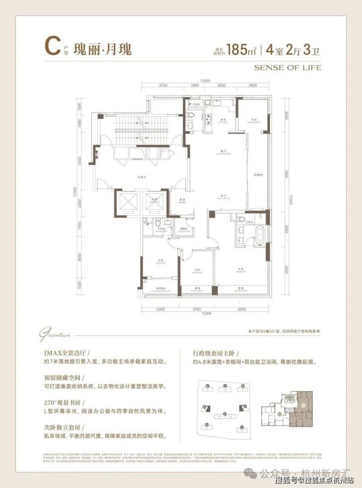 185㎡大户型,采用LDKB可变户型设计,将餐客厅、厨房、阳台打造成一个流动的家庭社交空间。此外,餐客厅拥有约7m的超长落地窗,书房与主卧尊享270°超宽采光面,适合在晨光与暮色中与家人共度温馨时光。