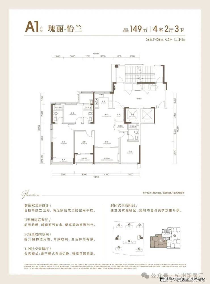 全盘两梯两户配置,标准层层高约3.1米,经典的改善盘骨相。最亮眼的,莫过于建面约149㎡主力户型,四开间朝南+南向双套房+独立储藏室,所有卧室与卫生间皆以最短动线布局, 让每一厘米都服务于生活。 它也是奥体在售仅有的149㎡入门级改善四房,堪称实用度和流通性的年度明星!
