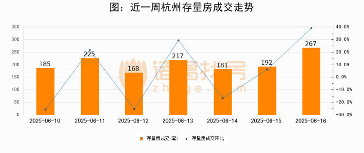 从存量房来看,2025年06月16日杭州存量房单日成交267套,比昨日增加75套,环比上涨39.1%。从近一周存量房成交来看,杭州存量房日均成交套数为205套,06月16日单日成交267套,高于近一周平均水平30.2%。