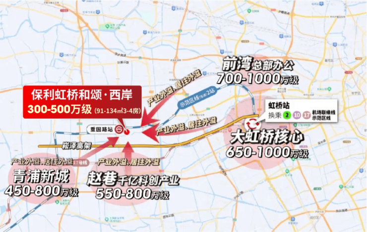 项目东面2站之隔的前湾、徐泾,房价已达700-1000万级,即便下游的青浦新城,房价也处于450-800万级
