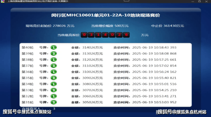 6月19日,闵行1幅地块出让,地块名称为颛桥镇MHC10601单元01-22A-10地块,规划用地性质为住宅用地,出让面积4.05公顷,容积率为2。经过40轮竞拍,最终由上海保利城市发展有限公司竞得,总成交价314026万元,溢价率12.95%。