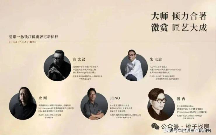力邀近境制作创始人唐忠汉、TCD²平仄设计创始人朱友庭、木杉景观创意总监JONO、名谷设计创始人潘冉、青墨建筑设计创始人余刚5位设计名家重磅携手。集匠艺之大成,共筑金沙湖当代奢宅新标杆。