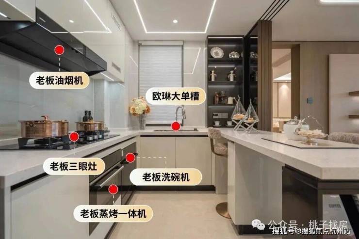 厨房:老板油烟机、三眼灶、蒸烤一体机、洗碗机四件套齐全;欧琳的大单槽,方便锅具等大厨具清洗。