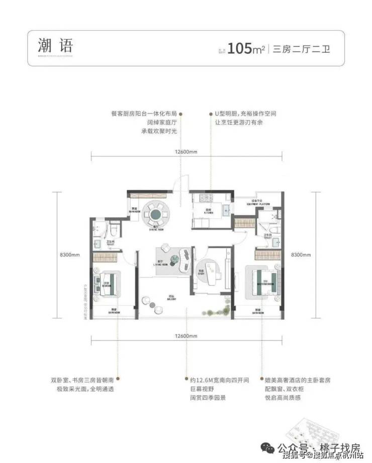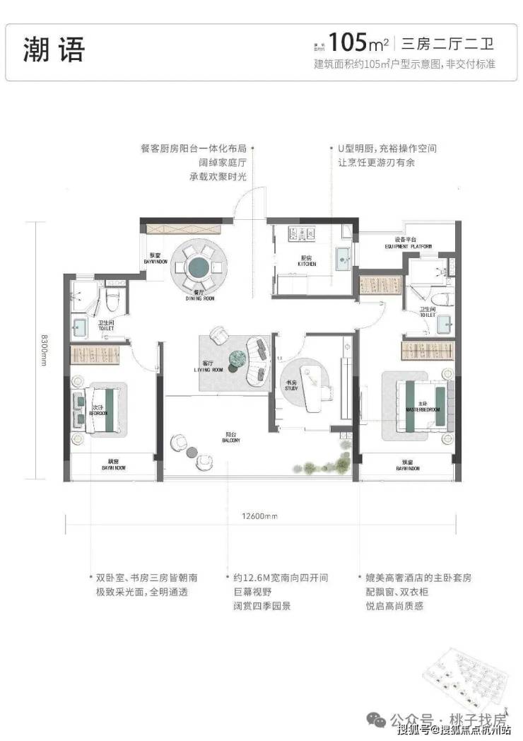 揽景小高层建筑面积约105-130㎡,为最大化景观面,突破性设计建筑面积约105㎡南向四开间。