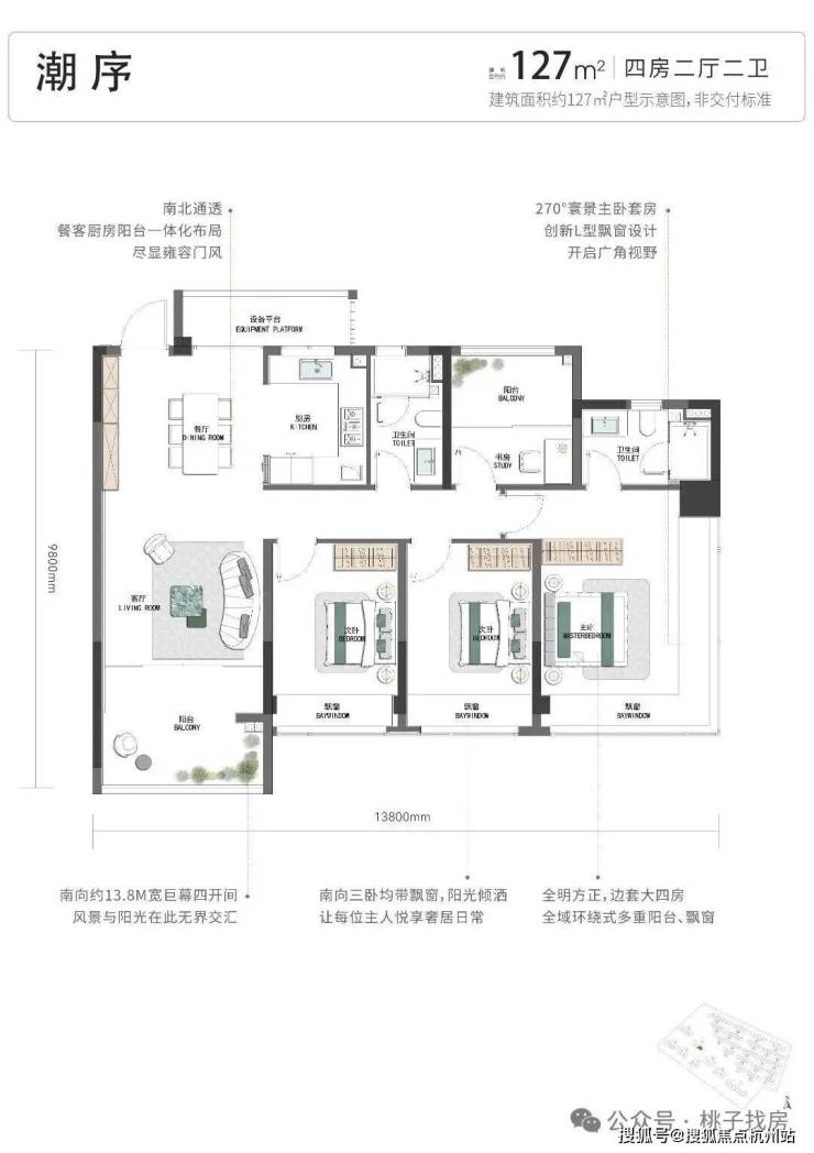 再来看项目的四房户型,有建面约127方、约130方2款。控总价的建面约127方:这款户型的每一点巧思,统统都是豪宅标准:LDKB的户型设计;封包阳台+3卧室均带飘窗;南向超大开间;