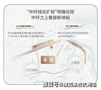 交通方面:项目紧邻长江西路地铁站(直线距离约150米),1站江杨南路,5站复旦,7站五角场。中环线北扩段明确兑现,军工路快速路25年开工,长江西路快速路列入上海市重大工程清单预备项目,快速链通城心,随着中环线北扩段的政策明确,淞南将正式进入中环时间。未来经逸仙高架,进入南北高架、内环高架、中环高架,可快速链通南北上海。