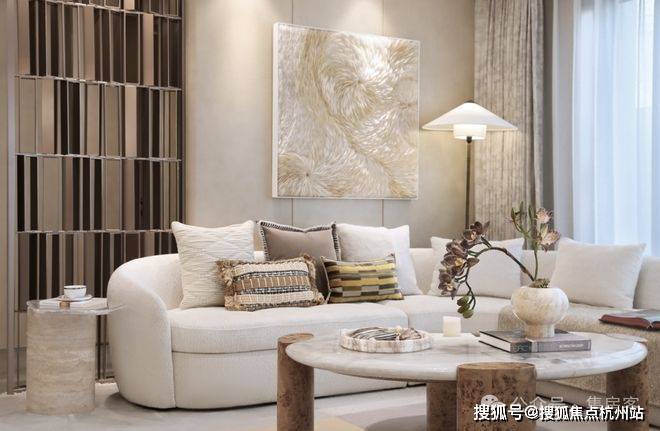 公建化的立面,四面铝板搭配大面积玻璃,阳台统一封包,底层的浅色天然石材还被打磨出弧线,脱去厚重外壳,轻盈洒脱。项目西侧直线约800米就是钱塘江,春来晴翠也在园区里编织了一幅山水画卷。