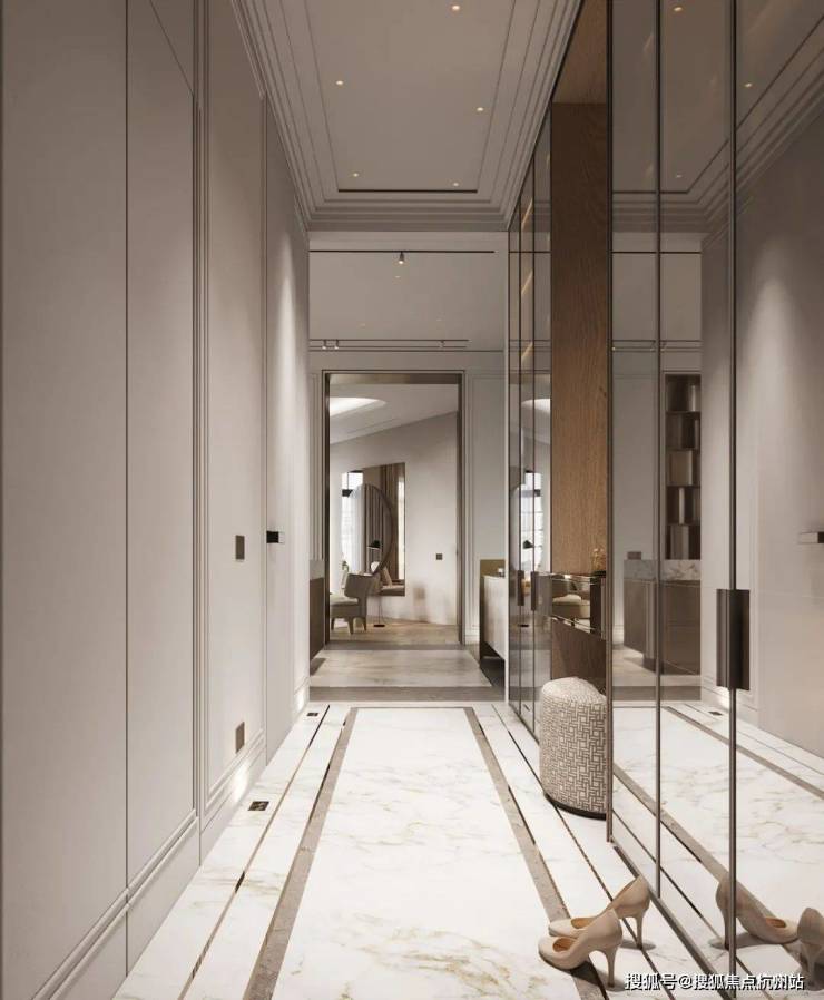 星空连廊的顶面采用香槟金铝板、墙面为爱马仕灰仿石砖,并镶嵌金属线条、就连地面都采用了夜里雪仿石砖。