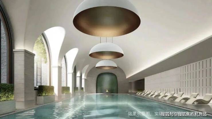 整个泳池天花板,呈现出海派拱形元素,落地玻璃窗外,是下沉式的景观空间: