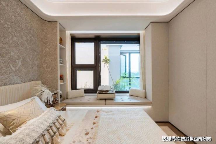 豪华的套房设计,北侧卫浴飘窗+南向床边双飘窗的设计 ,更是把这个空间的视野和收纳空间延展开来,尺度感真的很惊人。