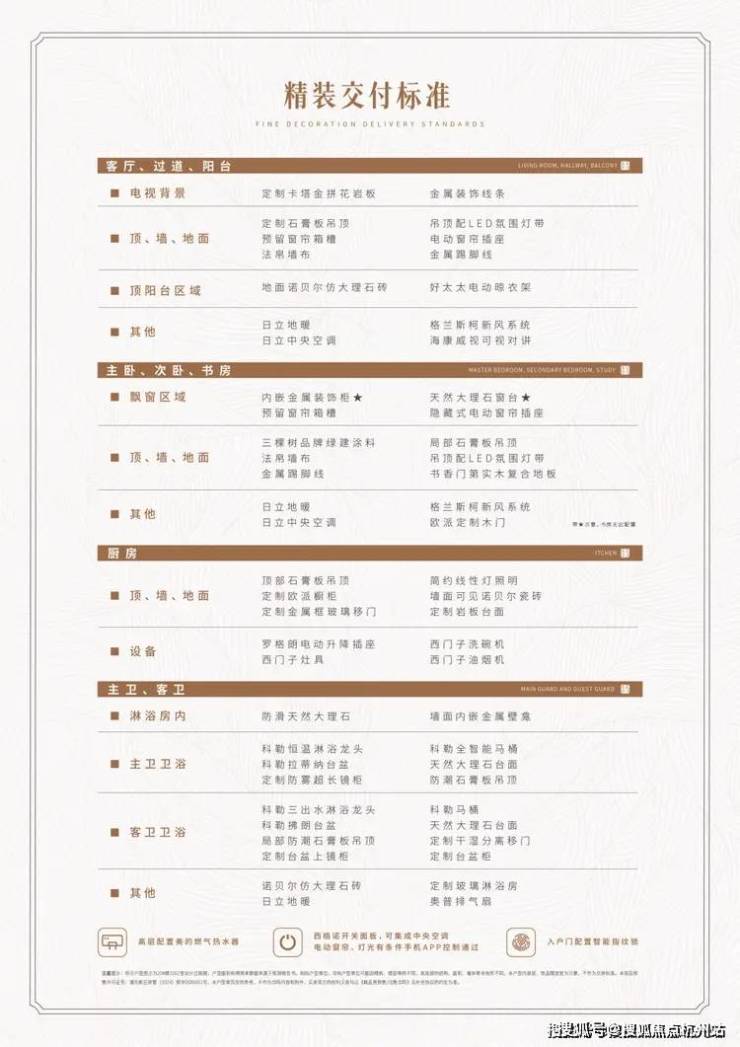 项目装修标准也是诚意满满,中央空调、地暖、新风系统“三大件”配齐,厨房、卫浴也有不少细节交付标准。