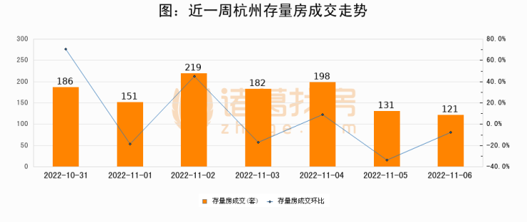 从存量房来看,2022年11月06日杭州存量房单日成交121套,比昨日减少10套,环比下降7.6%。从近一周存量房成交来看,杭州存量房日均成交套数为169套,其中11月02日成交量较高为219套,11月06日单日成交121套,低于近一周平均水平28.4%。