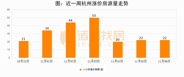 根据诸葛找房数据显示,杭州24小时涨价房源量为22套,较11月05日持平。