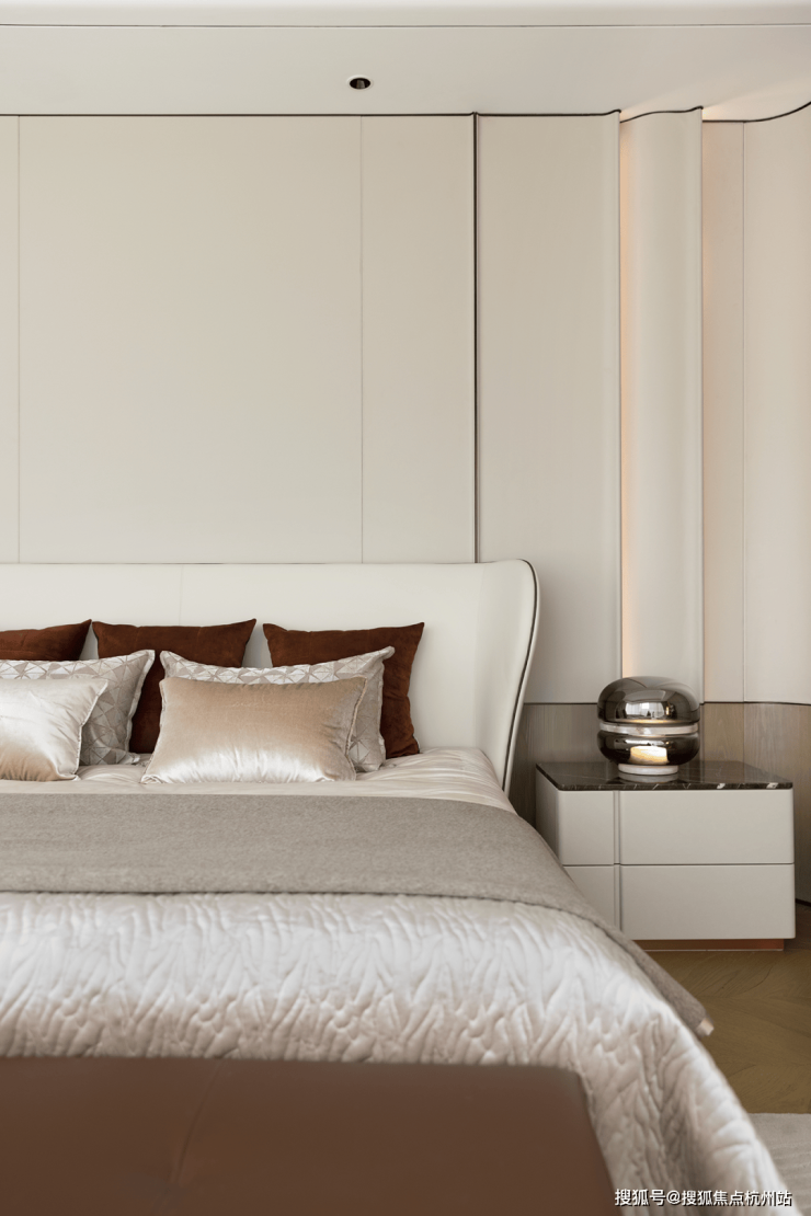 主卧延续了以米白和粽色为主的基调,打造出高级舒适的休憩之所。精炼的设计呈现出优雅整洁,简约而奢华的现代美感,在静谧之域中,安放生活的自在与柔软。