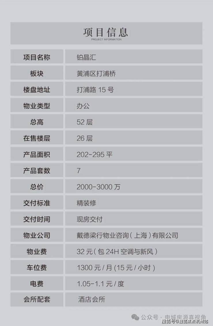 基本参数:产权 50 年,总高 53 楼,单层层高 3 米,6 梯 7 户设计,物业公司为戴德梁行物业咨询 (上海) 有限公司,物业费 32 元 /㎡/ 月,车位配比 1∶1,车位费 1300 元 / 月。