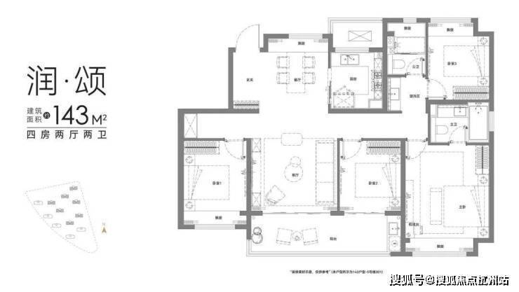 143㎡四室两厅两卫:得房率78%-82%,双阳台+独立家政间设计,总价约539-580万元