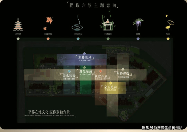 项目园林对轴线的运用同样出彩,堪称神来之笔的 “双轴六境” ,由 “礼序归家轴+景观漫步轴” 纵横交织,融在地文化,以“非遗”竹编形制,铺陈园林步道,同步淬取 “州桥壁落”、“紫藤熏风”、“天水远香” 等嘉定古今6景,提炼细节元素及专属色系,营造主题园林空间。