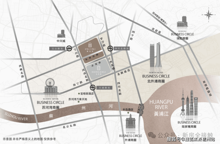 商业方面:3公里范围内,汇聚苏河湾万象天地、北外滩商圈、瑞虹商圈、南京西路商圈、外滩商圈、陆家嘴商圈等,东南侧步行可达18街坊,西南侧在建安康苑、湾上综合体地块。