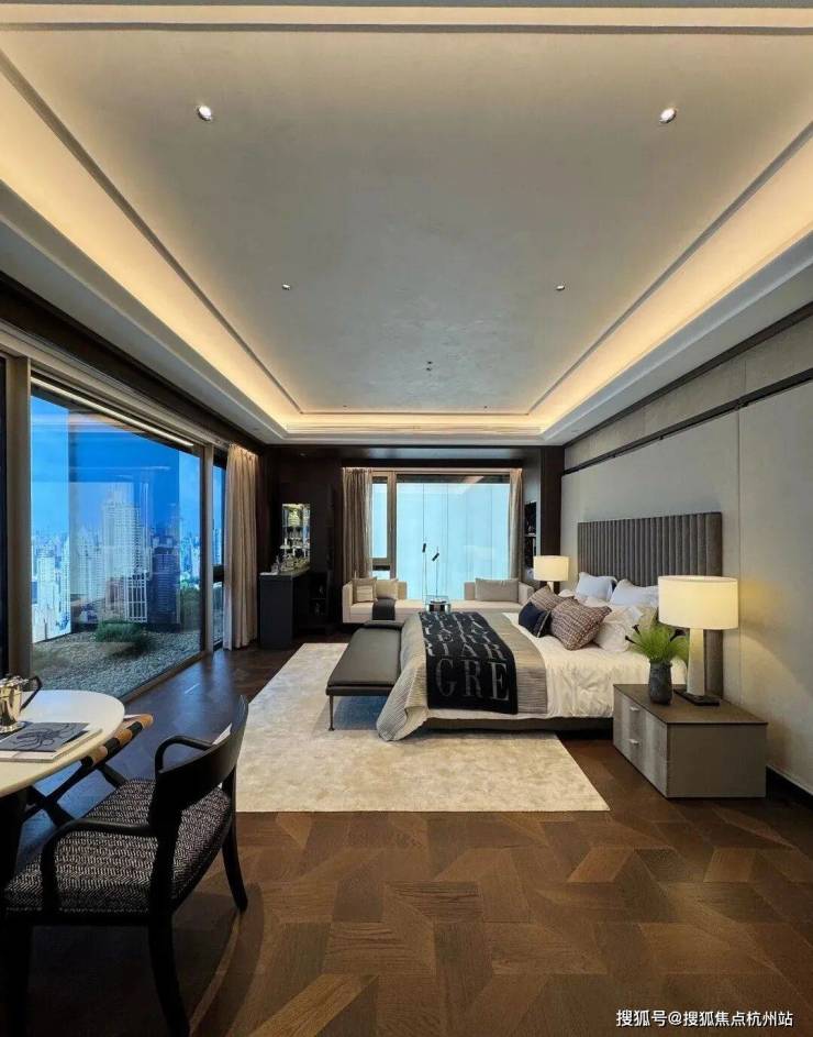 ·行政级主卧套房:双开门仪式感,超尺度空间,配置独立衣帽间、双台盆卫浴(浴缸+淋浴)、类酒店Mini Bar及私享客厅,休憩、社交、观景功能完备。