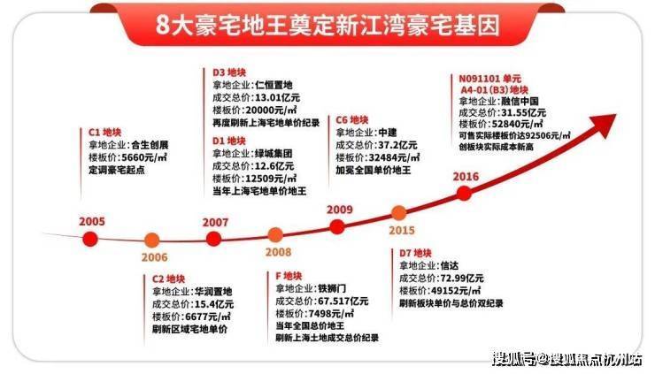 自2005年区域有土地成交伊始,新江湾城便开启了地王争霸的序幕,十年间 8个地王项目, 总价地王、单价地王纪录不断被刷新,镌刻着板块不可撼动的高端地位