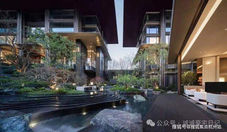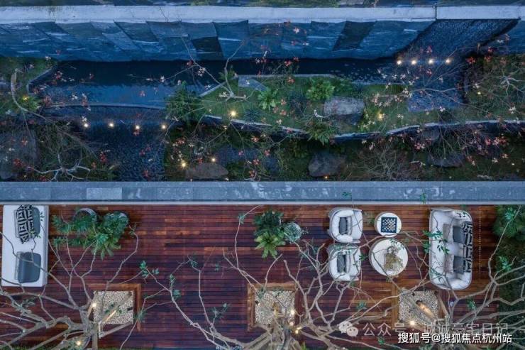 自【悬浮茶室】拾级而上,在【思韵书院】外,一处闲憩放空的【阅川水岸】至此呈现,脚下溪流自脚下蜿蜒而过;眼前,是 幻影蓝奢石池底 的幽邃微光。一株来自地 中海的油橄榄 ,与 一棵百年老桩紫薇 在此相望。