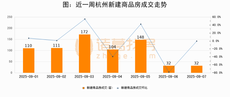 根据杭州市住房保障和房产管理局数据显示,2025年09月07日杭州新建商品房成交32套,较昨日持平