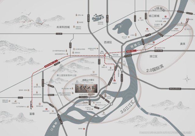 西侧还有富春山居高尔夫球场,球场南面正对着北之江公园,目前有亚运水上场馆在建。亚运会期间将承办皮划艇、赛艇、激流回旋三大比赛。想一想,当亲戚朋友在观看直播时,突然有人认出来,指着电视里的外景说:你的家,就在这里。是多么的令人艳羡?