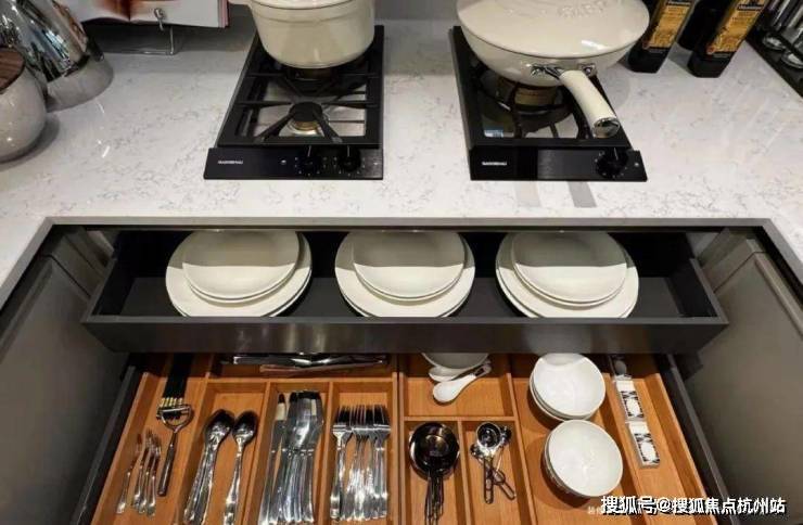 为使厨房成为「真正幸福之地」,璞元在各个细微之处倾注关怀,从地柜拉篮系统,到上柜系统,再到抽屉分格系统,浅抽与深抽搭配,让整个厨房空间,既百变,又充满秩序。