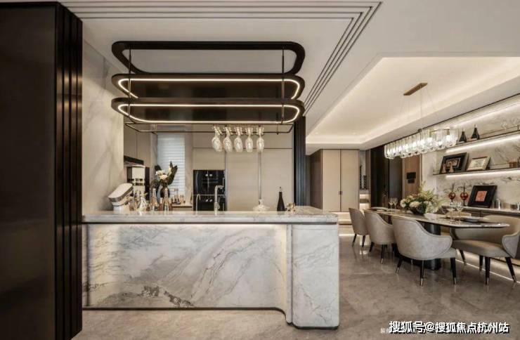 客厅背景墙的“烟雨江南”天然大理石,不同于传统平面背景墙,通过弧度及立体的造型处理,并镶嵌不锈钢材质,对于金茂而言,比奢石昂贵的,是让奢石真正与空间气场融为一体。