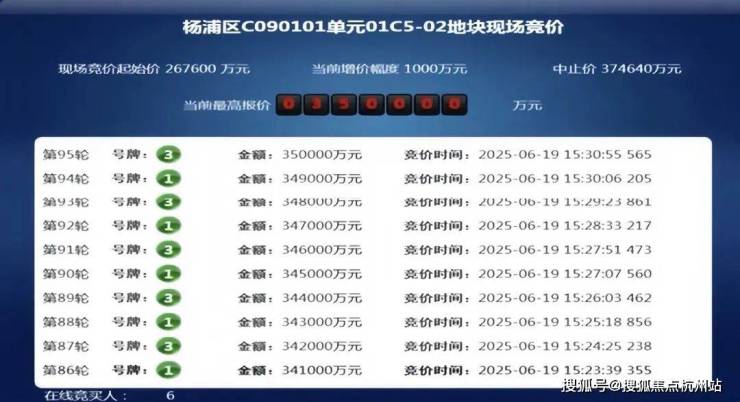 2025年6月19日,杨浦区平凉街道64街坊地块经历95轮激烈竞价,最终由央企保利发展以35亿元成功竞得,土地楼面价95530元/㎡,溢价率30.8%,创下杨浦区土地单价新高。