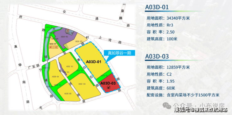A03D-01地块: 出让土地面积34340平方米,土地用途为普通商品房,规划容积率2.5,计容建筑面积85850平方米。