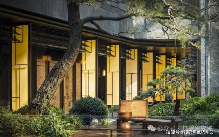 流瀑从金舟缓缓而下,流入了负一层的下沉式庭院,庭院里种满了又高又大的松树,四周一圈都是大块大块的老石皮,有野趣,也做出了贵重感。