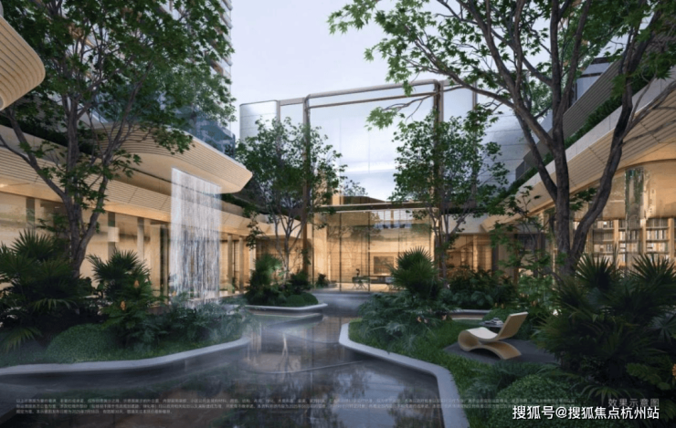 社区内 8 栋楼有 5 栋有架空空间覆盖,共计约 1700㎡,最高建筑层高约7.2米。架空空间以休闲下沉卡座、水吧台、休闲会客区打造,联动室外水池,营造出酒店式度假空间。此外,项目还规划有超 250平 “悬挑水池”,甚至可以在漂浮中冥想疗愈。下沉庭院四周设有不同功能空间,包括健身房、归家大堂、阳光地库光厅等,实现 360 度不同视角的景观体验。风雨连廊系统串联珍稀苗木与洄游动线,实现 “四季有景、步移景异” 的五星级度假体验。