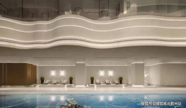 恒温泳池挑高约10米,营造出场馆级的开阔体验,顶部采光井将自然光引入池区,配合全地暖覆盖的更衣区与休息平台,整体对标重奢酒店的度假标准。