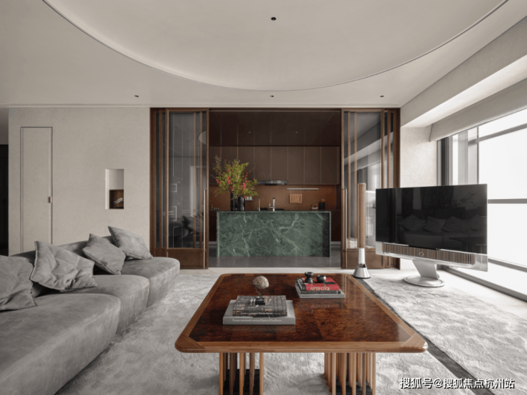 龙盛荟馆的接待处设计:空间讲究对称性、秩序感,暗绿纹哑光、温润的石材+仿铜金属板,调性和仪式感极佳,家具的选品又富有居家轻松氛围,有种俱乐部的感觉!