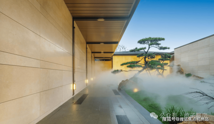 大门取意宋代二坡顶形制,在沉木米黄景墙里,嵌入18块价值百万的透光奢石,叠加苍劲的造型松……