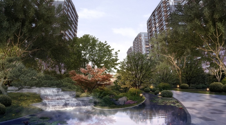 同时,园区内配置中式园林,将富春山的古石、西湖的金桂等元素植入园中,群松夹道,古石堆叠,泉水迎归,满园桂雨,既有满满的杭州中式感,又符合天人合一的自然审美,每一处都值得赏味驻足。