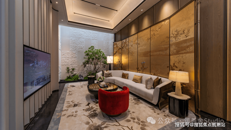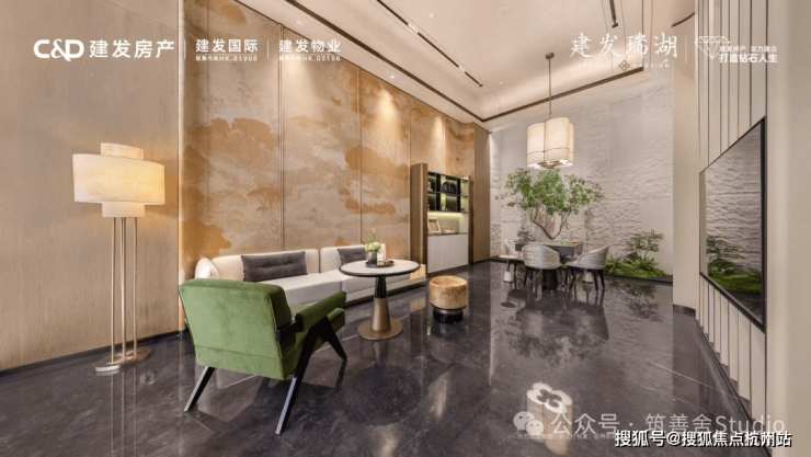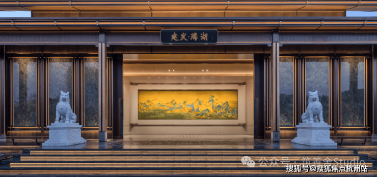 金山少见的双门规制,东门气势也尤为磅礴。步入其中,《蓬莱仙境》非遗漆画与西区山河遥相辉映,烟波浩渺处,藏风聚气,基业长青之意境油然而生。