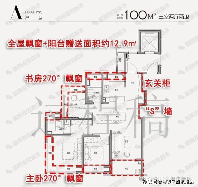 3、空间升级:超配双270°飘窗格局!市面上很少会有主卧及书房均设计270°飘窗的百平户型,稀缺性不言而喻~