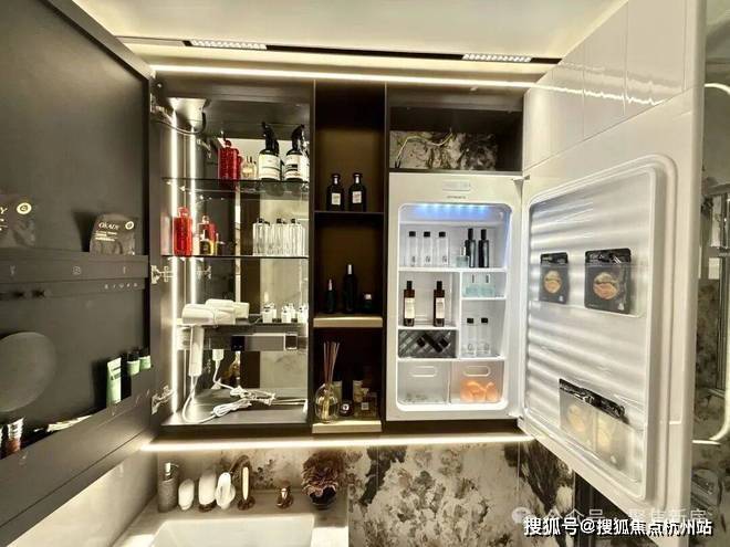 镜柜收纳空间也做了升级!不仅设计了方便拿取常用化妆品的壁龛,还配置了美妆冰箱,可谓是超级人性化考量!
