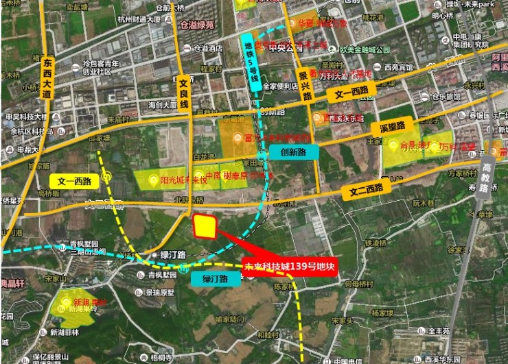 地块处于未来科技城的核心位置,不管是交通、医疗还是商业配套都相对比较齐全。除了文二西路和绿汀路两大主干道,地块距离地铁5号线创新路站和地铁3、5号线交汇的绿汀路站较近。北面浙一医院余杭分院预计2018年建成。周边富力科技之光项目、西溪永乐城、赛银国际广场等商业综合体众多,未来吃喝玩乐均能满足。